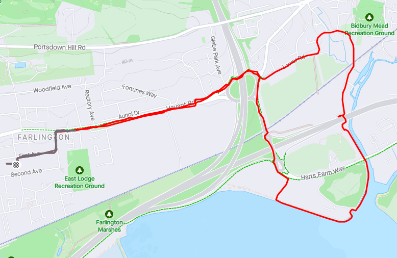 Approaching the 10 mile mark I start to get a bit of a second wind (pardon the pun). 10 miles always seems like a significant distance to me and I pick up my pace ever so slightly. I change from my usual audiobooks that I like to listen to when running, to a comedy podcast (The Wolf and Owl – extremely highly recommended) and turn onto the path that signifies the final leg of my journey. My kids call this path the “Dead Rat Trail” because they once saw a dead rat here, and imagining them talking about it amuses me as I complete the trail, turn north, then quickly west and am finally on the Havant road back home.