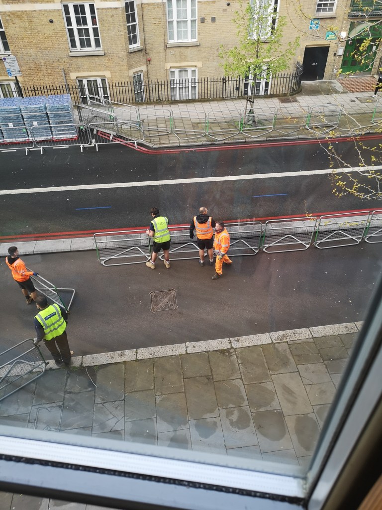 It’s about 6.30am and I have woken in my friends flat in Tooley Street to a load of clattering about. Making my way to the window, I can see that work has already started building the water station at the 12 mile mark. It must be time for the London Marathon!