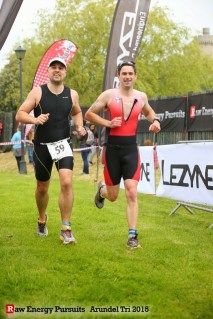 Practically neck and neck into transition he racked his bike and then there was no room for mine. Desperately trying to wedge my bike in between his bike and another competitors bike Bushy very kindly helped me. Running shoes on I was out of transition in a very quick 45 seconds with Bushy hot on my heels. At this point I felt I only had one chance. Go out quickly at the start of the run and hope that he cannot stay with me, generating a gap which I can hold for the rest of the 10K.