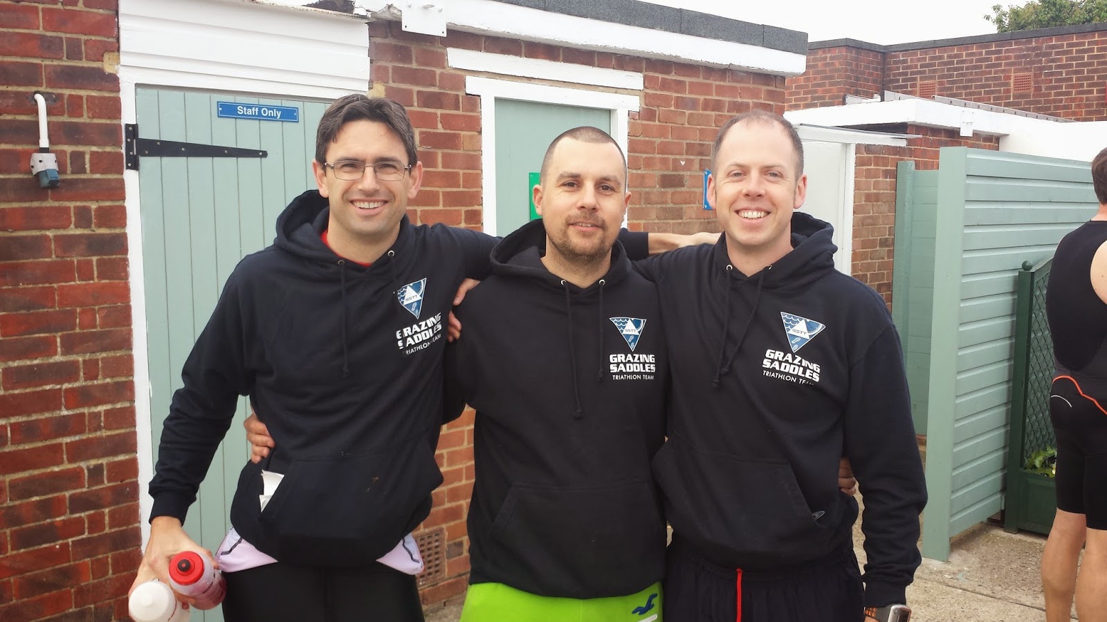 During this time I had been chatting to my fellow Grazing Saddles team members and to a few other people I knew from the Pompey Triathletes who were also competing that day. The buzz was great. Andy was swimming first and I gave him a huge cheer as he got out of the pool and made his way to transition. Quickly running round to the bike exit we saw him come out and immediately proceed to cycle the wrong way. Fortunately we shouted at him, he turned around and was on his way onto the bike course. Neil was next to swim; however I didn’t see him get out of the pool as I was already queuing up for my swim start time.