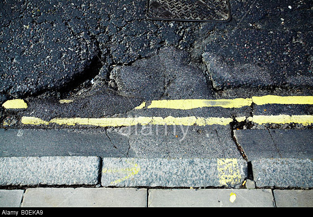When you cycle you keep to the left of the road so cars and other faster road users can overtake. This is just good etiquette. The problem with doing this is that the shoddy road surface is even more shoddy the closer you get to the verge. There are potholes that are actually small caves and endless miles of broken tarmac (an example of the sort of thing I mean is on the right).
