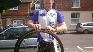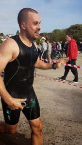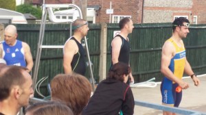 During this time I had been chatting to my fellow Grazing Saddles team members and to a few other people I knew from the Pompey Triathletes who were also competing that day. The buzz was great. Andy was swimming first and I gave him a huge cheer as he got out of the pool and made his way to transition. Quickly running round to the bike exit we saw him come out and immediately proceed to cycle the wrong way. Fortunately we shouted at him, he turned around and was on his way onto the bike course. Neil was next to swim; however I didn’t see him get out of the pool as I was already queuing up for my swim start time.