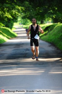 Practically neck and neck into transition he racked his bike and then there was no room for mine. Desperately trying to wedge my bike in between his bike and another competitors bike Bushy very kindly helped me. Running shoes on I was out of transition in a very quick 45 seconds with Bushy hot on my heels. At this point I felt I only had one chance. Go out quickly at the start of the run and hope that he cannot stay with me, generating a gap which I can hold for the rest of the 10K.